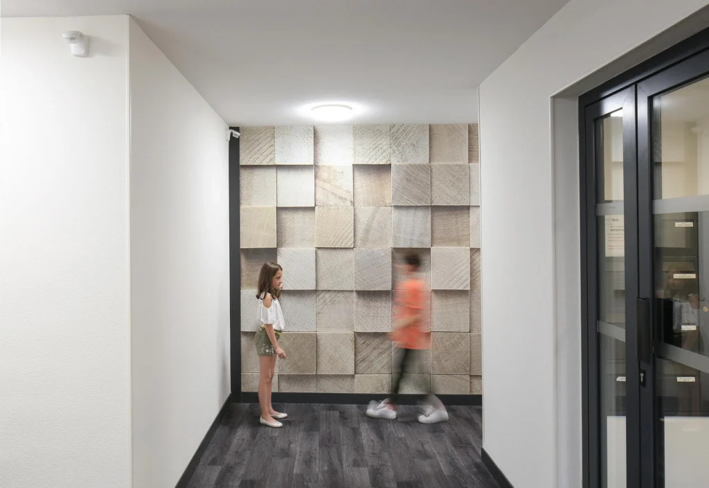 Nous facilitons également l’orientation des résidents comme des visiteurs, par des repères paysagers, artistiques et ergonomiques tels que des systèmes d’éclairage automatique.